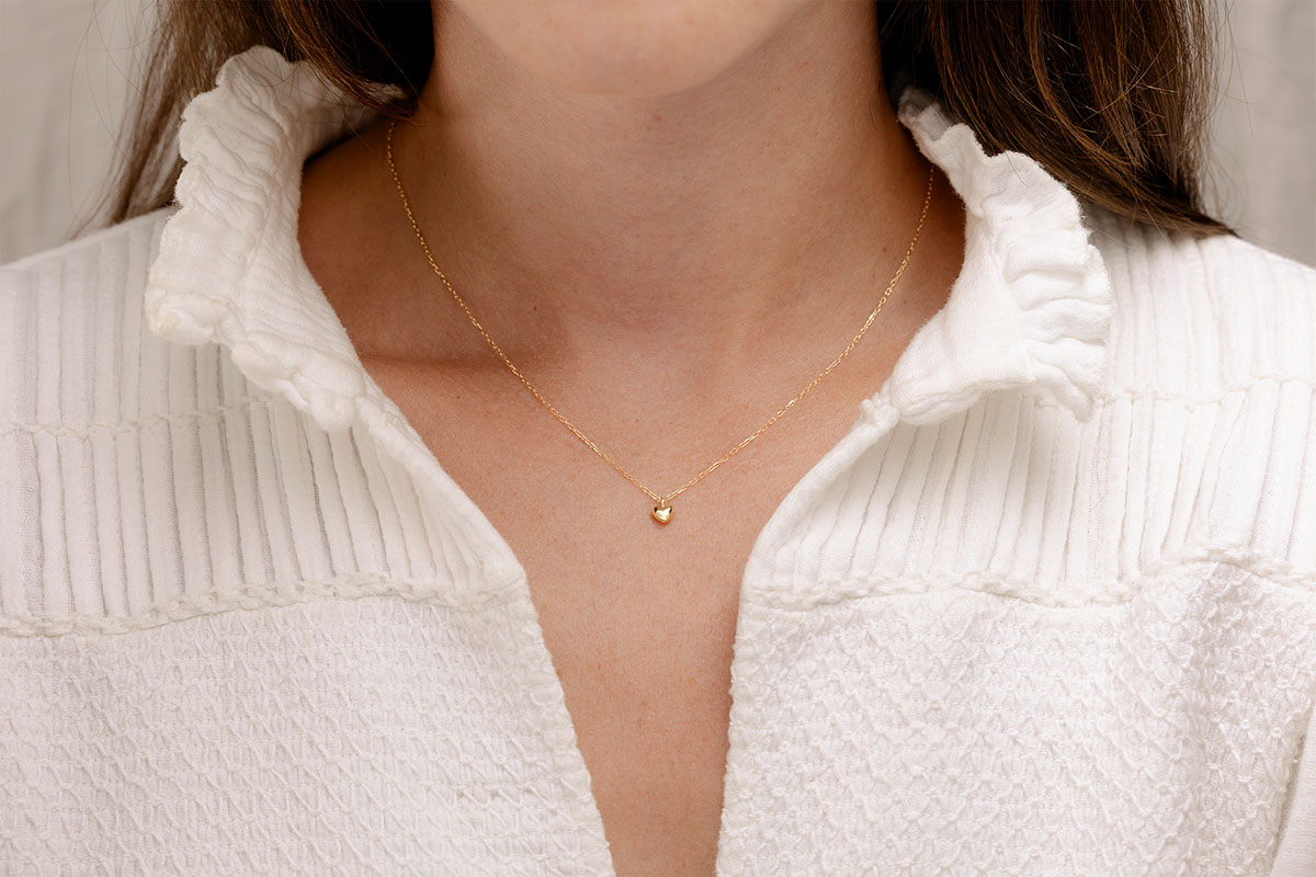 A polished heart suspended from a delicate yellow gold chain.A tender and timeless piece, perfect for celebrating everyday love. With gold chain 375/- . Yellow gold (9K Gold = 375/-): 1.3 g.More dimensions