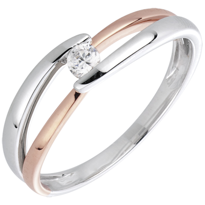 A diamond held by two white gold and two rose gold arms for an elegantly elevated ring. 1 diamond : 0.10 carat - Rose gold (18K Gold = 750/1000): 2.20 g.