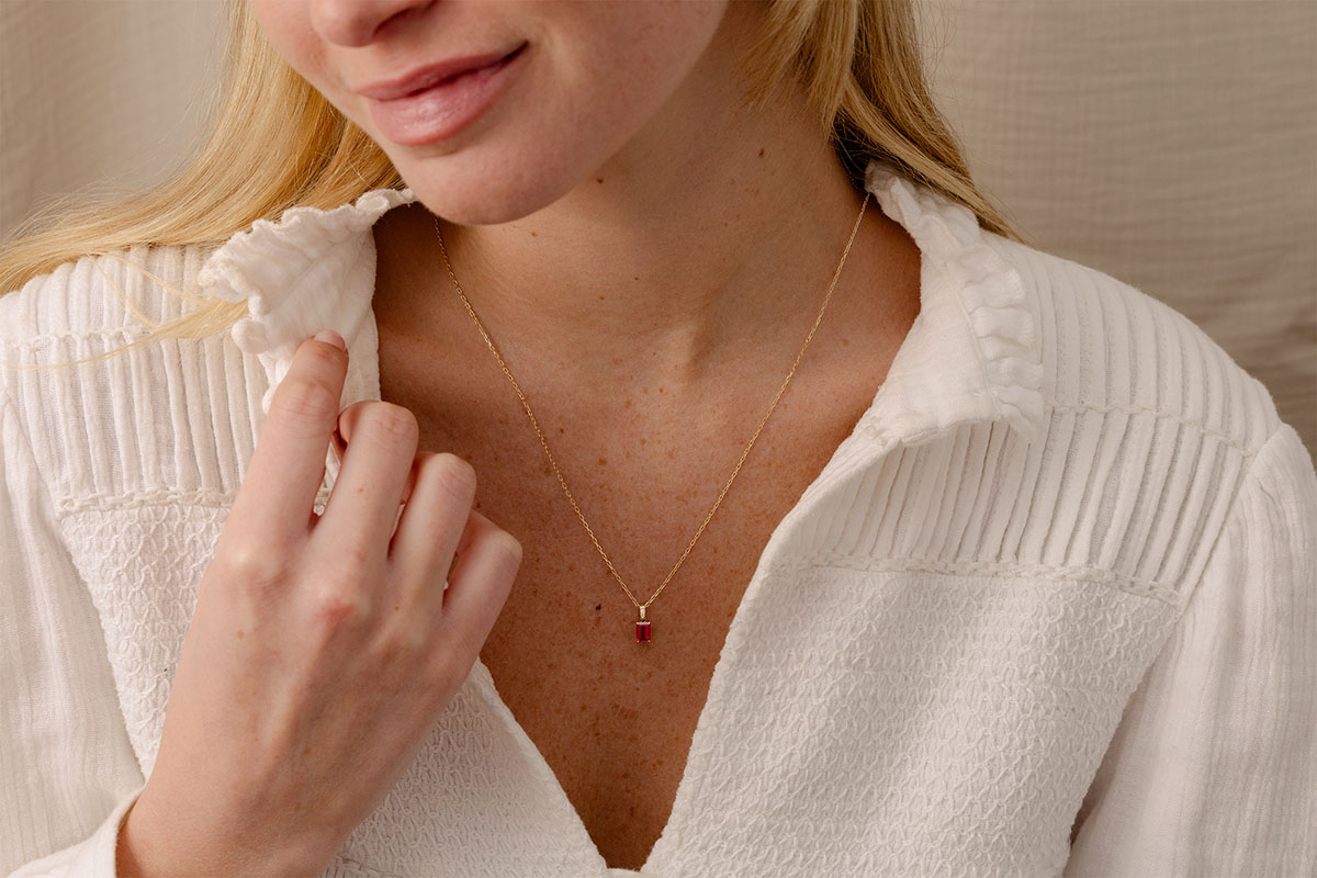 A stunning 0.8ct rectangular ruby, elevated by three delicately-set lab-created diamonds on the bail and sides of the ruby.A radiant jewel with timeless charm, blending the power of red and the softness of gold.