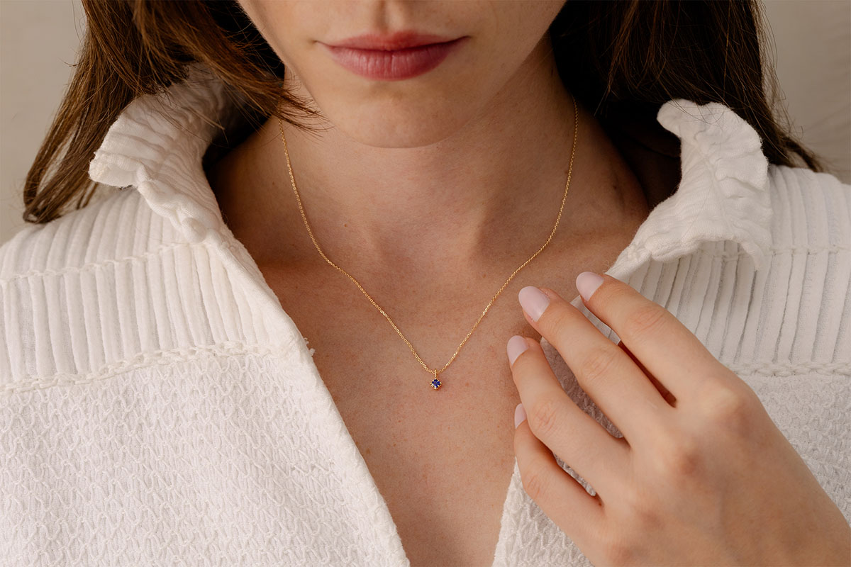 A radiant sapphire set on a minimalist mount.The elegance of a deep blue sparkle, exuding subtle sophistication at the nape of your neck.