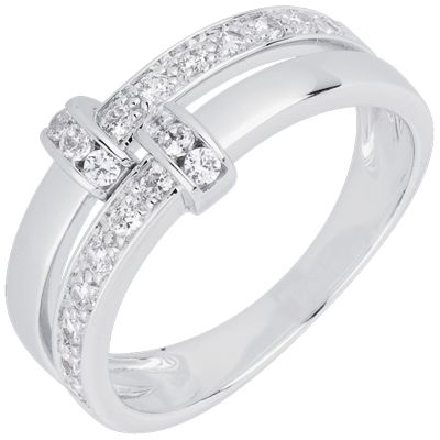 A split shank white gold ring half paved, half smooth is linked together by a white gold band paved with brilliant cut diamonds, creating an intricate multi stone design. 20 diamonds : 0.32 carat - White gold (18K Gold = 750/-): 3.7 g. More dimensions