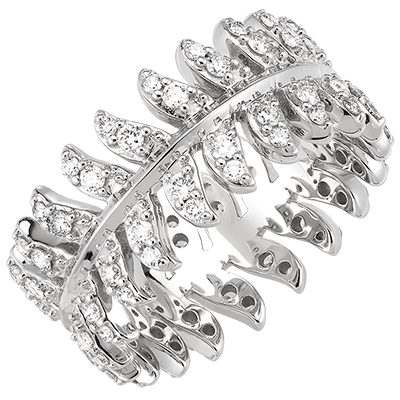 The Révérence ring in 18-carat white gold is distinguished by its circular feather motif delicately set with 50 synthetic diamonds. Reflecting the majestic spirit of the Panache collection, this ring is an example of refinement and brilliance, ideal for adding a touch of sparkle to your hand. White gold (18K Gold = 750/-): 6.8 g. Laboratory Diamond : 80 - Total: 0.77 carat More dimensions