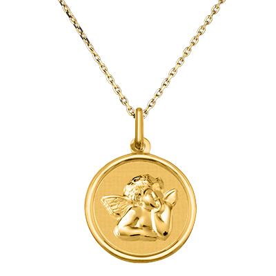 A symbol of protection and benevolence, this medal depicts Angel Raphaël in a contemplative pose inspired by classical art. Diameter: 15 mm Finish: Polished Custom engraving available on the back Delivered in a refined presentation box, ready to gift. Without chain. Yellow gold (9K Gold = 375/-): 0.9 g. More dimensions