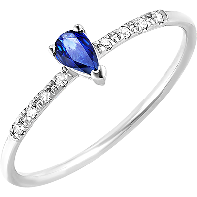 A precious white gold setting encrusted with diamonds holds a magnificent pear-cut sapphire.