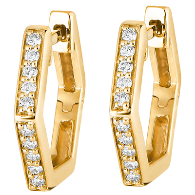 A pair of yellow gold hexagonal hoops set with diamonds for a graphic yet modern look. Jewel with some character.