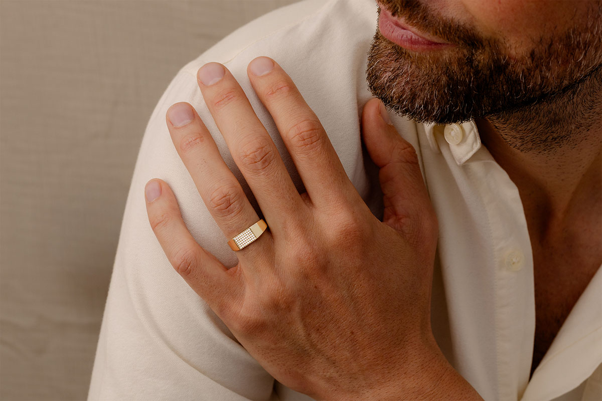 A yellow gold signet ring with a rectangular base generously paved with 54 diamonds. A delicate yet generous jewel.