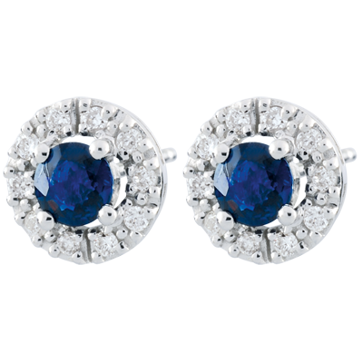 A white gold diamond-encrusted circle protects a sapphire like a nest.
