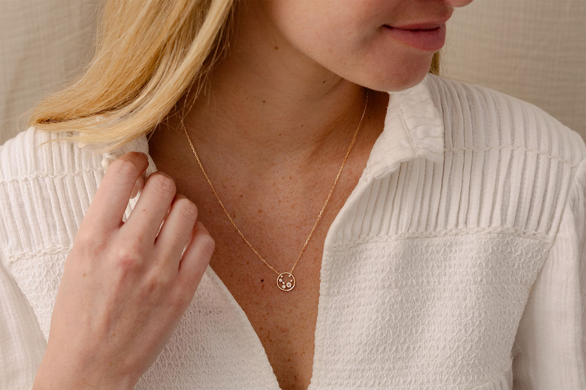 Thirteen lab-grown diamonds blossom within a golden circle reminiscent of a constellation.A radiant and harmonious necklace, perfect for those who wish to carry a touch of starlight every day. With gold chain 375/- . Yellow gold (9K Gold = 375/-): 1.4 g. Laboratory Diamond : 13 - Total: 0.28 carat More dimensions