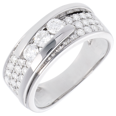 A paved frame highlighted by a double ring gently opening a diamond trilogy for an exceptional ring