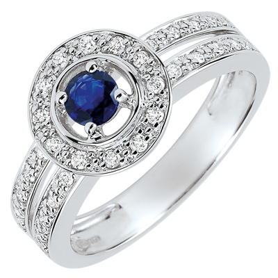 The central sapphire is elegantly enhanced in a shrine of brilliant diamonds. A double ring set with diamonds carries it and sublimates perfectly the magnificence of this white-gold engagement ring. 0.2 carat central sapphire 32 diamonds : 0.17 carat - White gold (18K Gold = 750/-): 3.5 g. Blue Sapphire : 1 - Diamond white : 32 - Total: 0.24 carat More dimensions
