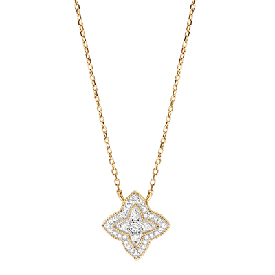 This necklace combines the brilliance of diamonds with a flower-inspired design. With gold chain 375/- . 37 diamonds : 0.13 carat - White and Yellow Gold (9K Gold = 375/-): 1.5 g. More dimensions