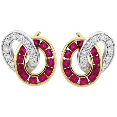 A white gold circle and diamonds is joined for life with a yellow gold circle of rubies.