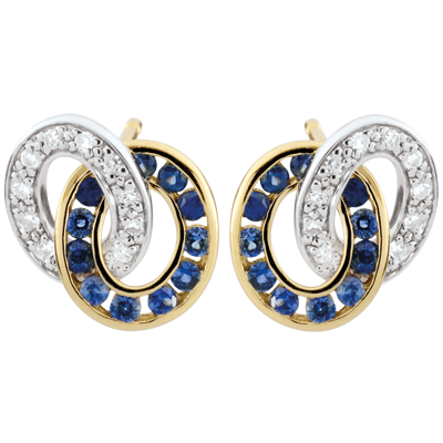 A white gold circle and diamonds is joined for life to a circle of sapphires and yellow gold .