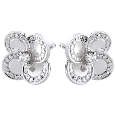Two modern 4 leaf clovers with their sides illuminating with polished gold and diamond outlines 2 diamonds : 0.06 carat - White gold (9K Gold = 375/-): 1.4 g. More dimensions