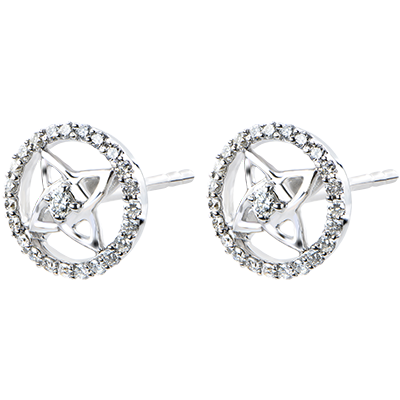 A delicate vintage touch for this pair of earrings composed by a central diamond fixed on a diamond paved frame with a star motif. A very delicate and feminine jewel. 48 diamonds : 0.26 carat - White gold (9K Gold = 375/-): 1.6 g. More dimensions