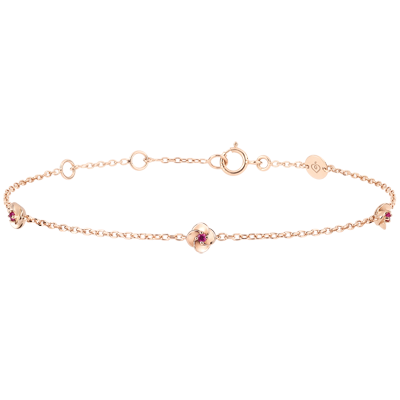 A delicate bracelet of sparkling flowers whose petals open up to show an eternal ruby heart. This bracelet chain is great for casual wear. Bracelet with adjustable length: 17 cm, 16 cm, 14.5 cm. Motif is 4.2 mm long by 4.2 mm high. Pink gold (18K Gold = 750/-): 1.3 g. Ruby : 3 - Total: 0.036 carat More dimensions