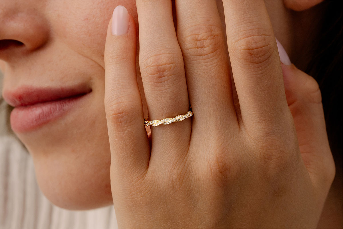 A ring where two yellow gold threads set with diamonds intertwine like an eternal embrace.