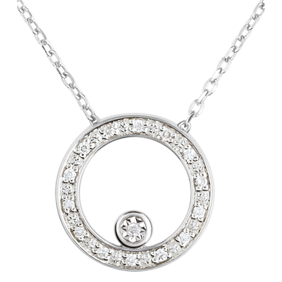 A gold diamond-encrusted circle on which a diamond encircled with white gold is perched hanging from a white gold chain. Timeless and elegant for all occasions. With gold chain 375/- . 15 diamonds : 0.08 carat - White gold (9K Gold = 375/-): 2 g. More dimensions