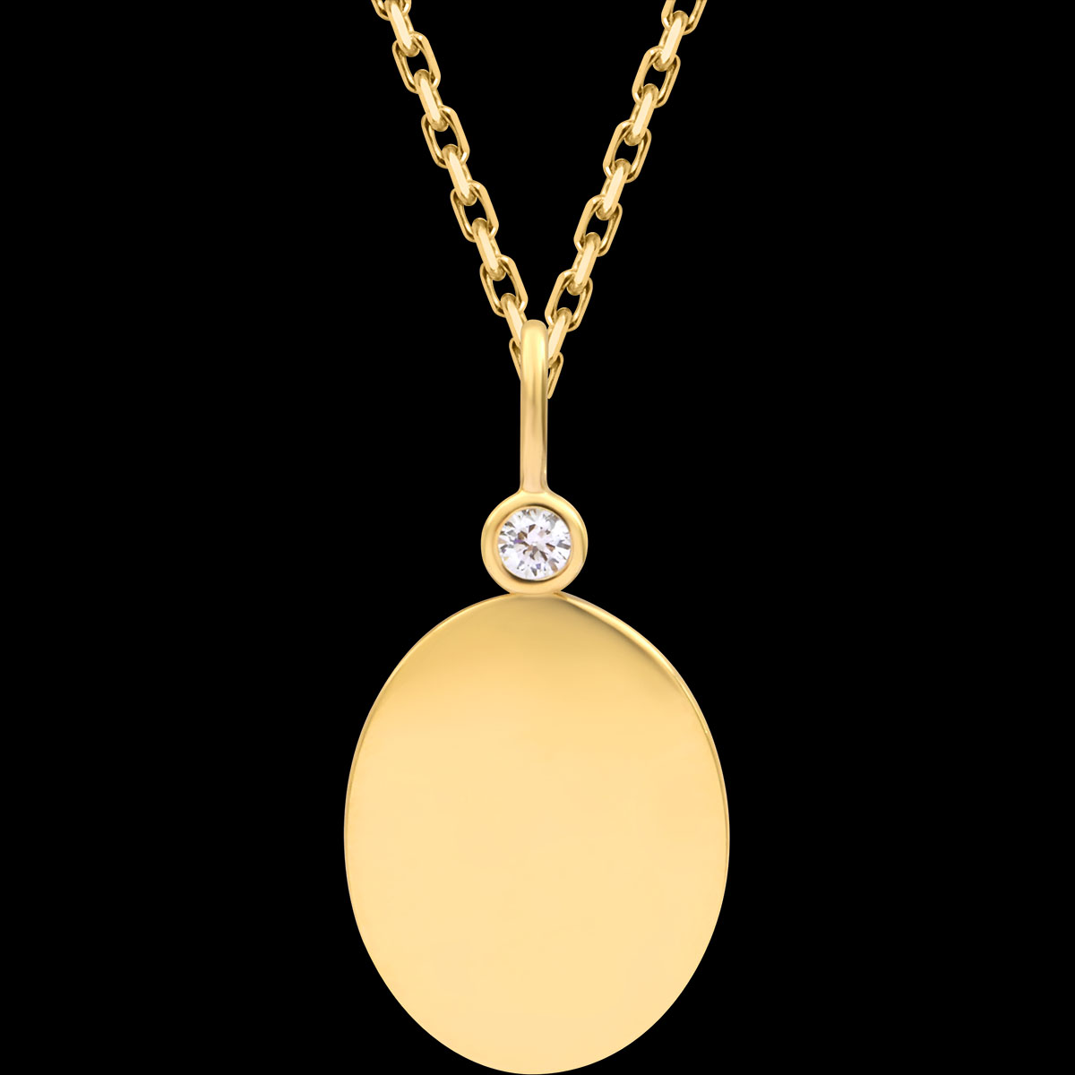 This elegant 18K yellow gold oval medal features a smooth, radiant surface, enhanced by a bail adorned with sparkling synthetic diamonds. Perfect for personal engraving, this refined piece makes an exceptional baptism or newborn gift.Diameter: 14 × 11 mmFinish: Polished yellow goldCustom engraving available on the reversePresented in a luxurious box, ready to gift