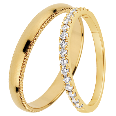 A refined pair of wedding bands for her & him. For her, a half-pavé band set with 18 sparkling diamonds (0.26 carat), for him, a finely engraved 3mm yellow gold band.
