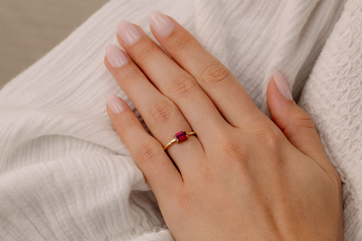 A 0.5-carat rectangular synthetic ruby shines at the centre, highlighted by four delicately set synthetic diamonds on the band.An elegantly bold silhouette, designed to illuminate your every gesture.
