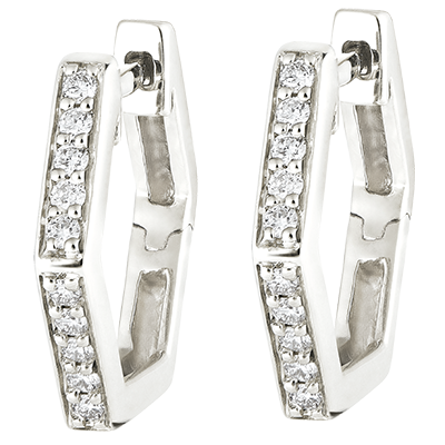 A pair of white gold hexagonal hoops set with diamonds for a graphic yet modern look. Jewel with some character.
