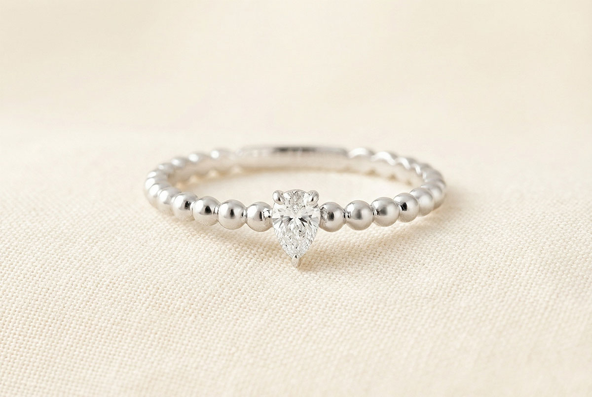 The Solitaire Bubble Pear is composed of a delicate pear-cut diamond set on a bubbled white gold ring for a touch of modern grace