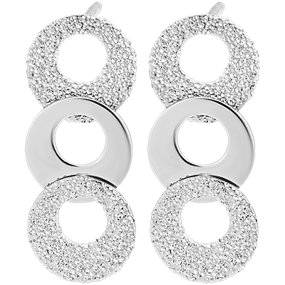 A pair of decidedly modern white gold stud earrings. Adorned with a motif of 3 interconnected circles, two in textured gold - diamond effect - and one polished. Love at first sight guaranteed.