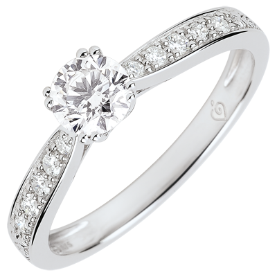 A solitaire diamond is carried by 8 claws on a refined setting studded with diamonds.