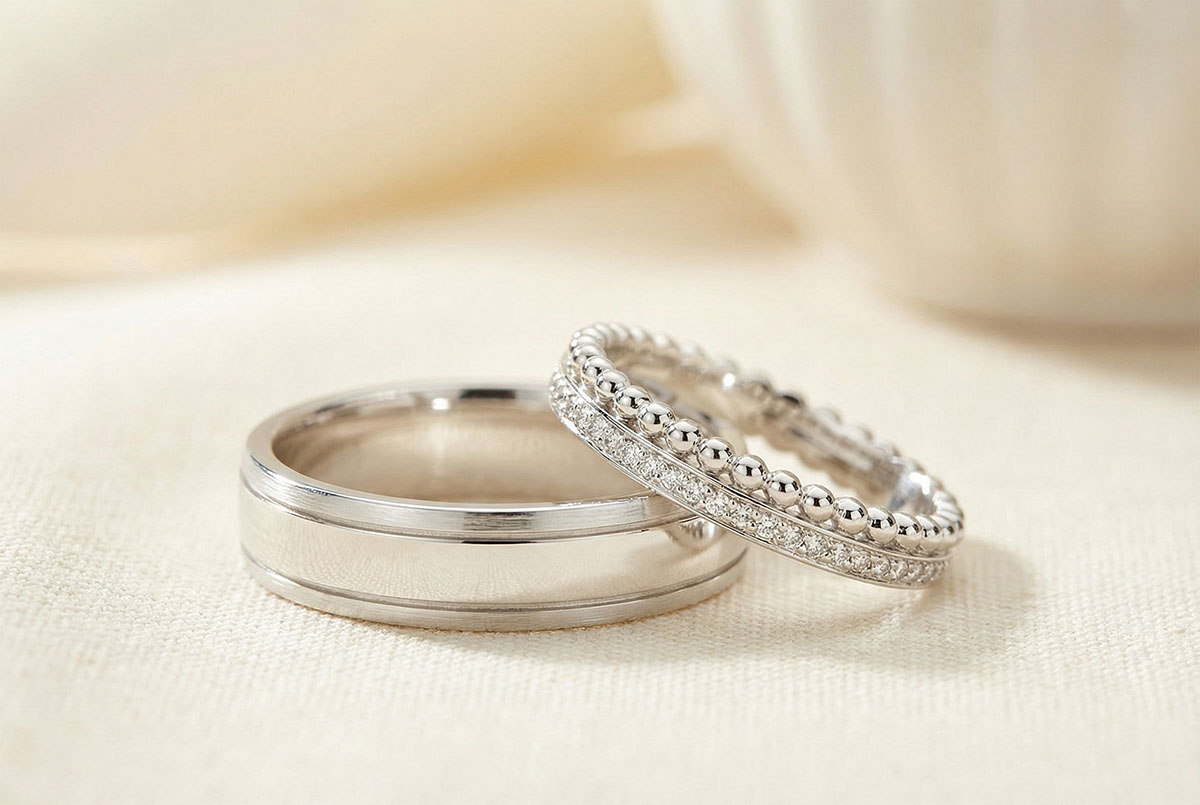 An elegant wedding band pair for her & him. A white gold ring adorned with diamonds paired with a beaded gold ring for her, and a brushed white gold band highlighted with a horizontal strip of polished gold for him.