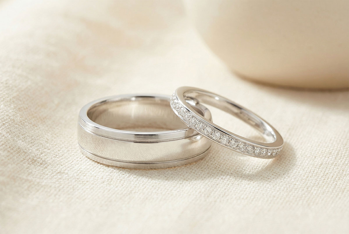 An elegant pair of wedding bands designed for her & him. For her, a timeless and refined pavé-set white gold ring; for him, a brushed white gold band adorned with a horizontal strip of polished white gold, combining understated sophistication with individuality.