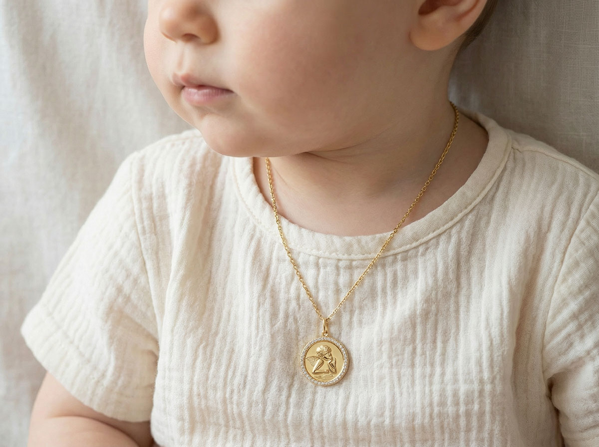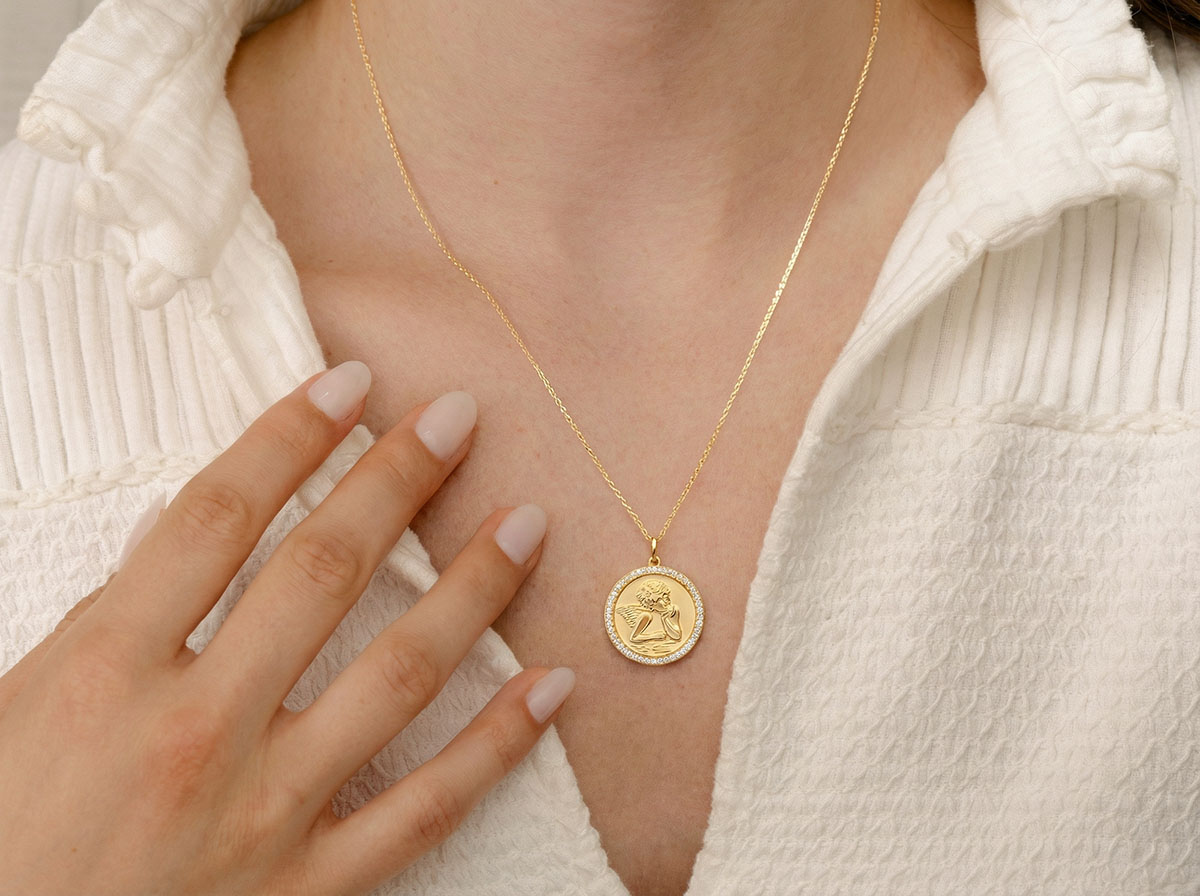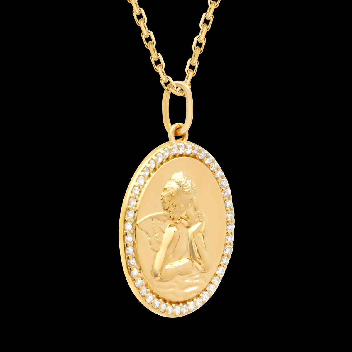 This round medal in 9ct yellow gold features a cherub illuminated by a glowing halo, elegantly surrounded by a set of sparkling synthetic diamonds, bringing brilliance and refinement to its timeless design.Diameter: 17 mmFinish: Polished yellow goldPresented in a sophisticated box, ready to gift