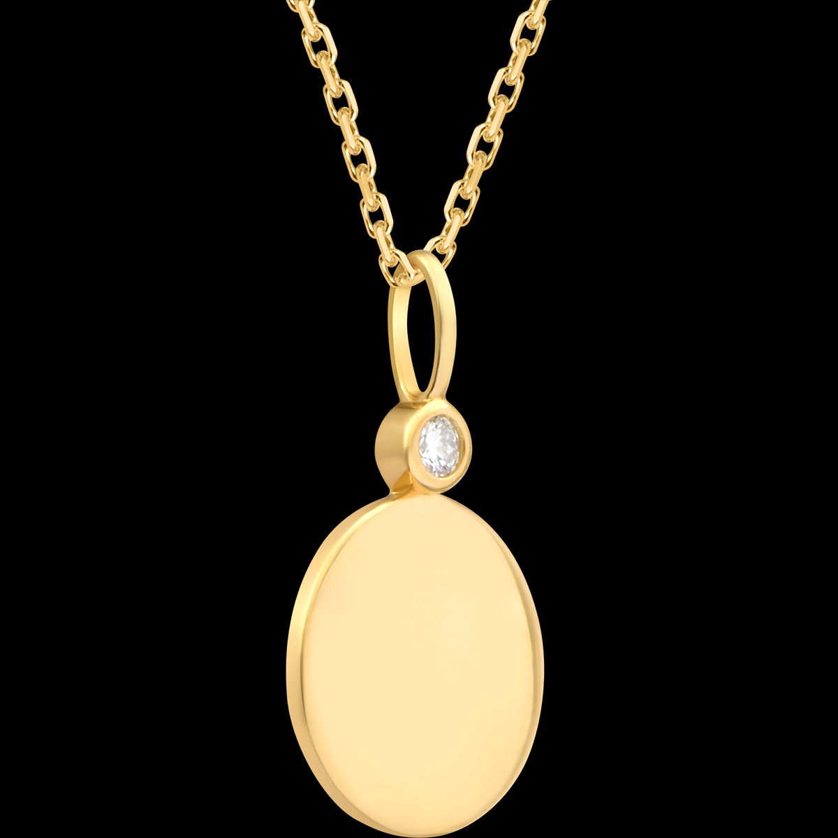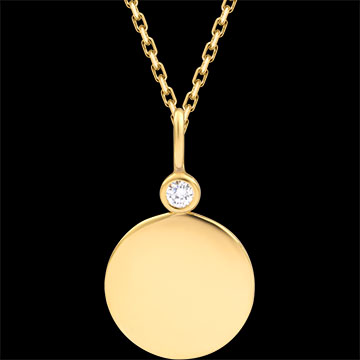 This elegant 9-carat yellow gold round medal is accentuated by a dazzling diamond set at the top, offering a refined canvas for your own engraving and unique symbolism. Diameter: 11mmFinish: PolishedCustomizable engravingDelivered in a luxurious box, ready to gift.