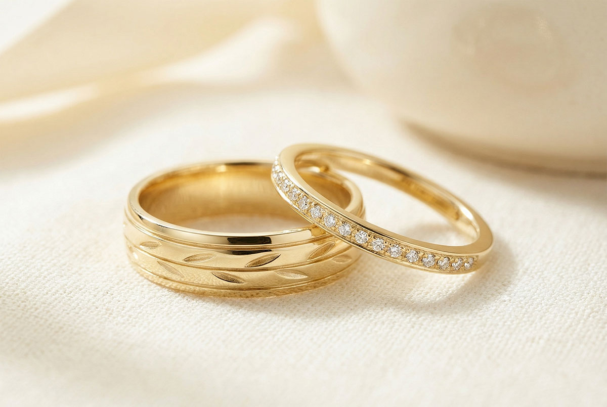 An elegant pair of wedding rings for her & him. A half-set diamond ring for her, and a broad yellow gold band engraved with eternal foliage for him.