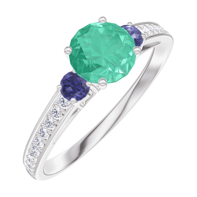 « L'ATELIER » Nº1002730Ring White gold 9 carats - Synthetic emerald round 0.5 Carats - Ring settings Blue Sapphire - Setting Laboratory Diamond 4.5