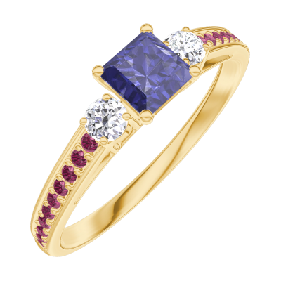 « L'ATELIER » Nº161330Ring Yellow gold 9 carats - Blue Sapphire Princess 0.3 Carats - Ring settings Diamond white - Setting Ruby