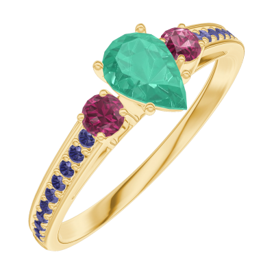« L'ATELIER » Nº162254Ring Yellow gold 9 carats - Emerald Pear 0.3 Carats - Ring settings Ruby - Setting Blue Sapphire