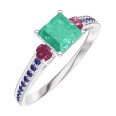 « L'ATELIER » NO. 164356Ring White gold 9 carats - Emerald Princess 0.5 Carats - Ring settings Ruby - Setting Blue Sapphire