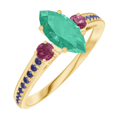 « L'ATELIER » Nº164754Ring Yellow gold 9 carats - Emerald Marquise 0.5 Carats - Ring settings Ruby - Setting Blue Sapphire