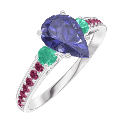 « L'ATELIER » NO. 166491Ring White gold 18 carats - Blue Sapphire Pear 0.7 Carats - Ring settings Emerald - Setting Ruby