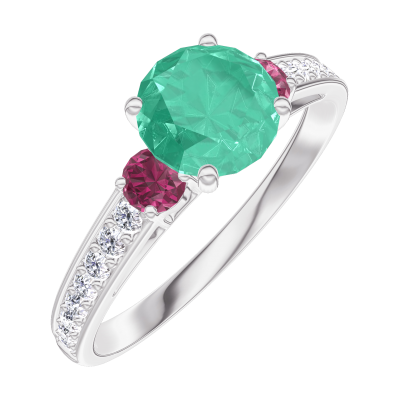 « L'ATELIER » Nº166647Ring White gold 18 carats - Emerald round 0.7 Carats - Ring settings Ruby - Setting Diamond white 5