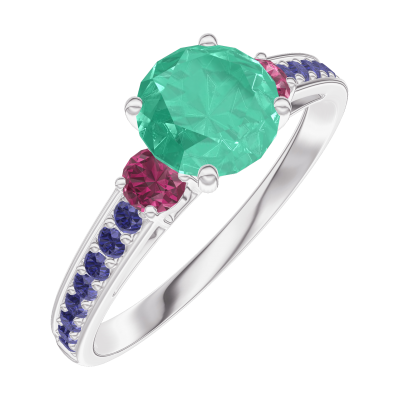 « L'ATELIER » NO. 166656Ring White gold 9 carats - Emerald round 0.7 Carats - Ring settings Ruby - Setting Blue Sapphire 4.9