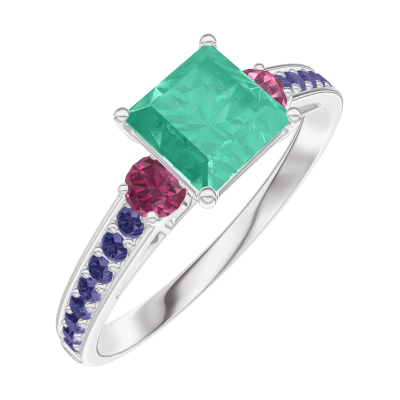 « L'ATELIER » NO. 166755Ring White gold 18 carats - Emerald Princess 0.7 Carats - Ring settings Ruby - Setting Blue Sapphire