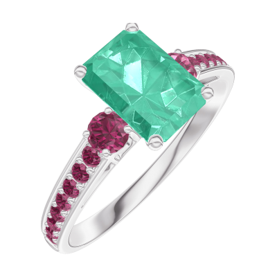 « L'ATELIER » NO. 166851Ring White gold 18 carats - Emerald Baguette 0.7 Carats - Ring settings Ruby - Setting Ruby