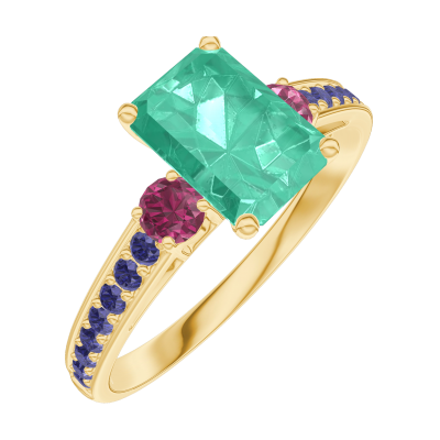 « L'ATELIER » Nº166853Ring Yellow gold 18 carats - Emerald Baguette 0.7 Carats - Ring settings Ruby - Setting Blue Sapphire