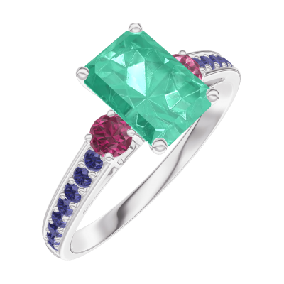 « L'ATELIER » NO. 166855Ring White gold 18 carats - Emerald Baguette 0.7 Carats - Ring settings Ruby - Setting Blue Sapphire