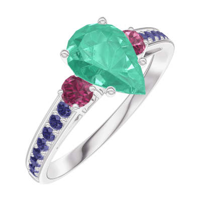 « L'ATELIER » NO. 167056Ring White gold 9 carats - Emerald Pear 0.7 Carats - Ring settings Ruby - Setting Blue Sapphire