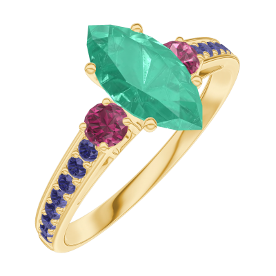 « L'ATELIER » Nº167153Ring Yellow gold 18 carats - Emerald Marquise 0.7 Carats - Ring settings Ruby - Setting Blue Sapphire