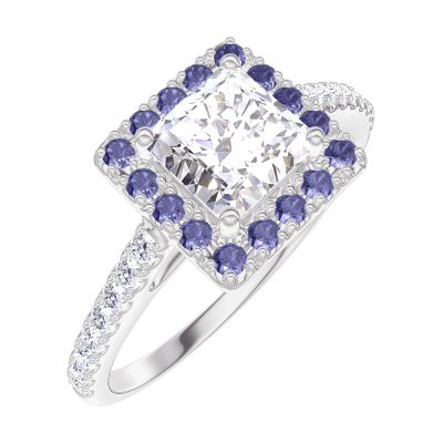 « L'ATELIER » Nº170087Ring White gold 18 carats - Diamond white Princess 0.5 Carats - Halo Blue Sapphire - Setting Diamond white 4.1