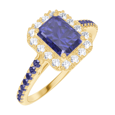 « L'ATELIER » NO. 170686Ring Yellow gold 9 carats - Blue Sapphire Baguette 0.5 Carats - Halo Diamond white - Setting Blue Sapphire 4.7